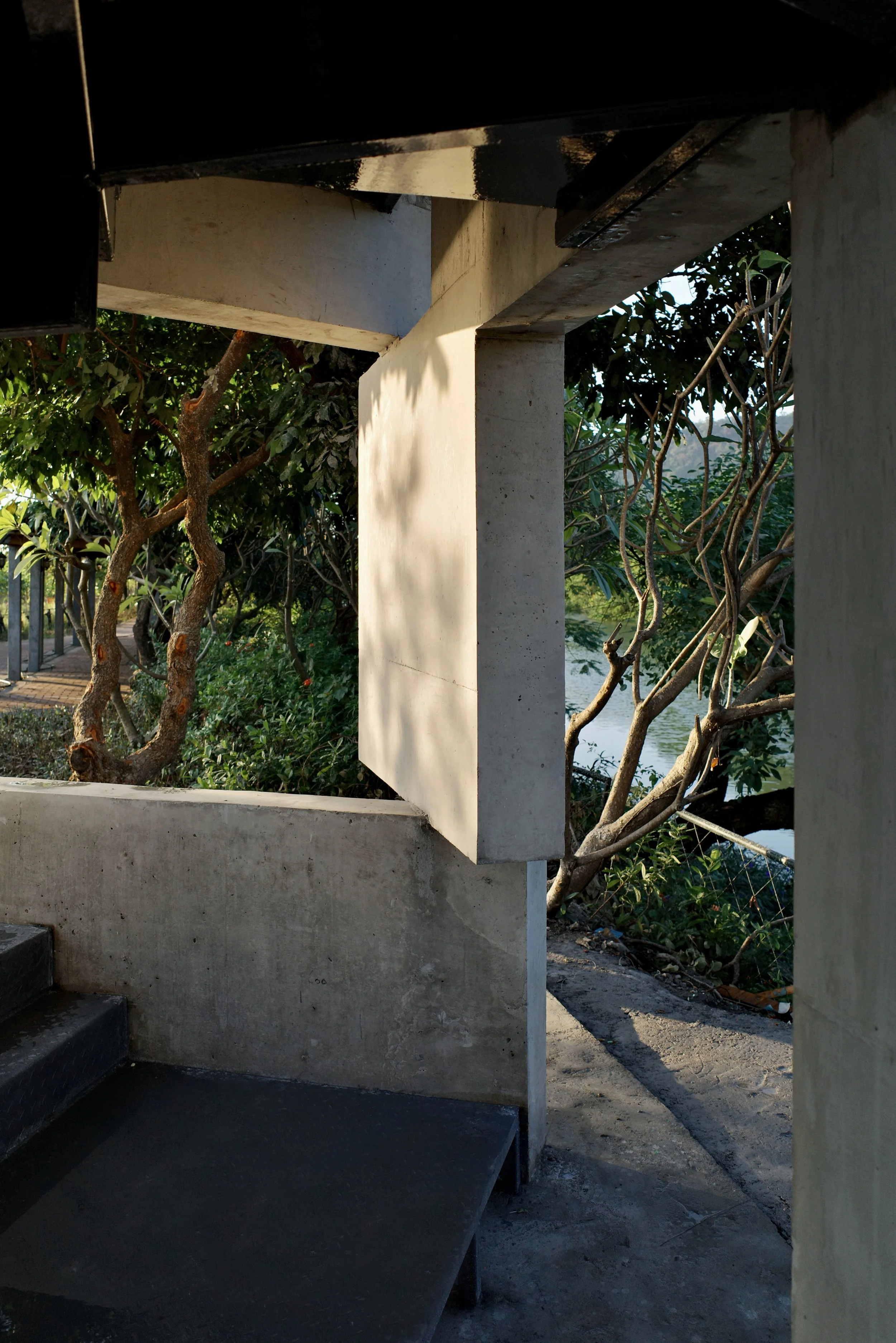 材料的处理是建筑与自然关系的关键。外侧墙面通过拉槽形成粗糙肌理,为未来植物附着提供条件,使建筑在时间中逐渐被绿植覆盖。而内侧则保持光滑混凝土表面,作为艺术介入的载体。