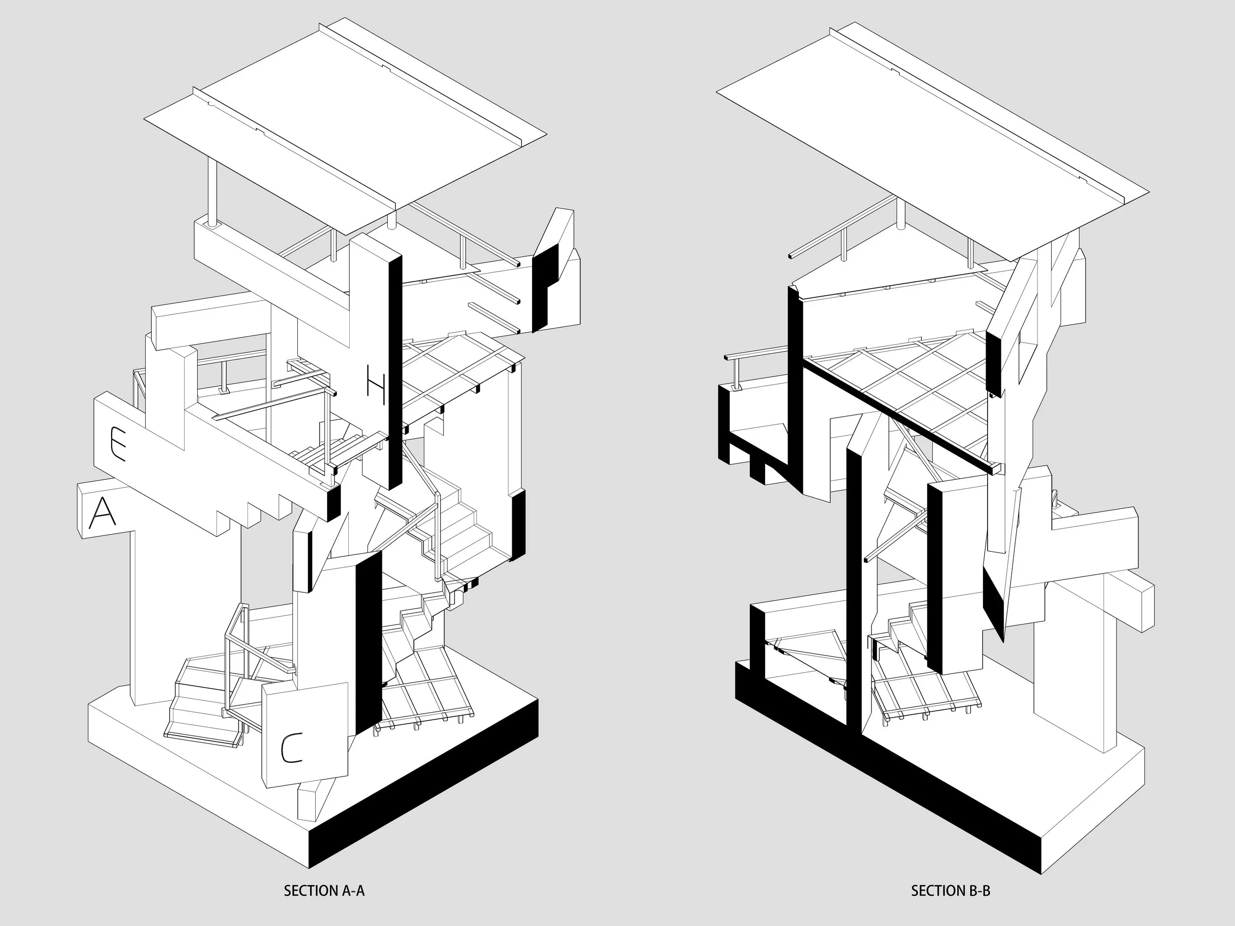 看似随机的墙体关系,实际上依赖精确的结构控制。混凝土墙体内部隐藏着由梁与柱构成的连续框架体系,使其在保持“非稳定”视觉感的同时,具备可靠的结构逻辑。建筑通过多次现场浇筑完成,建造过程本身也成为时间叠加的体现。