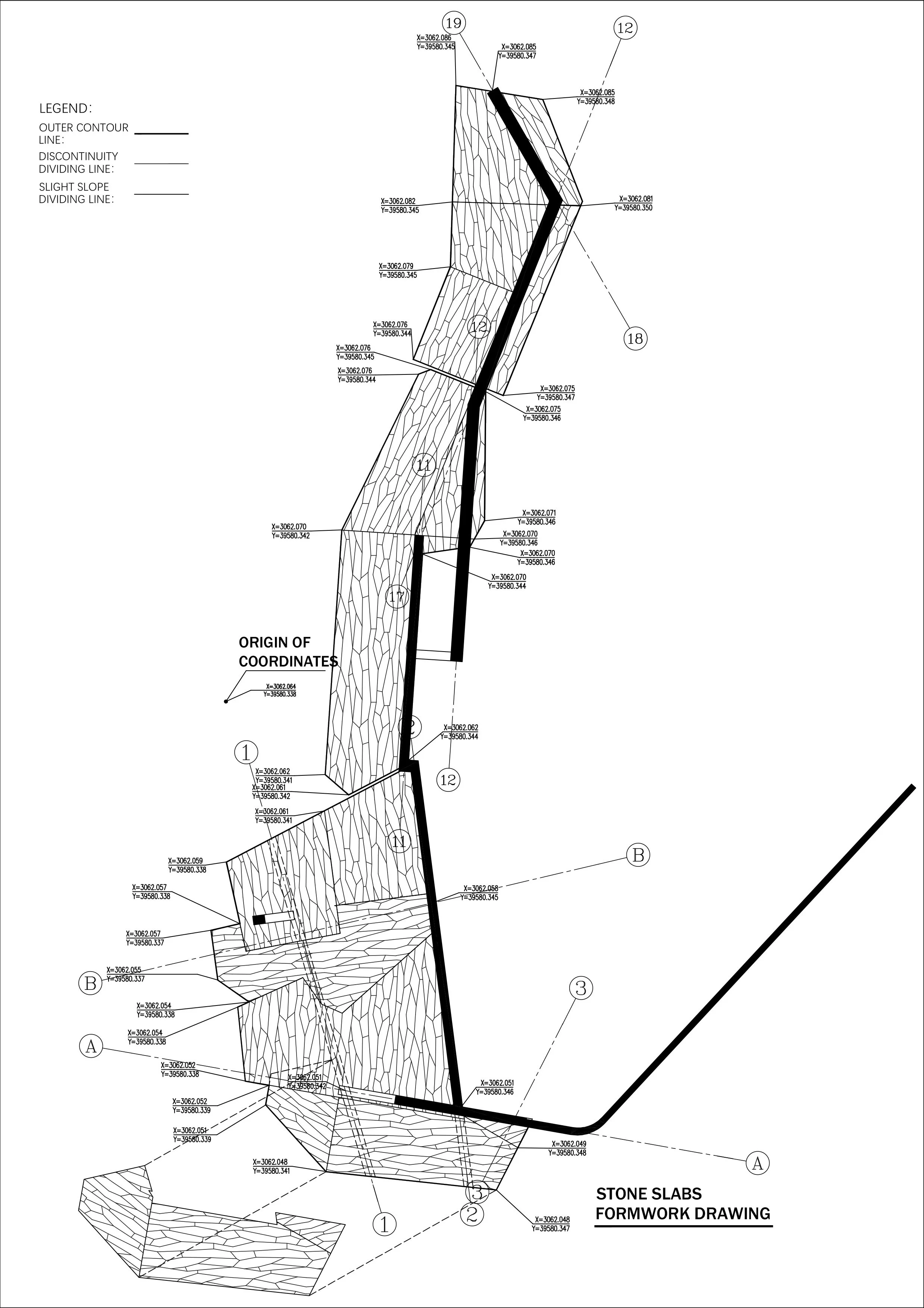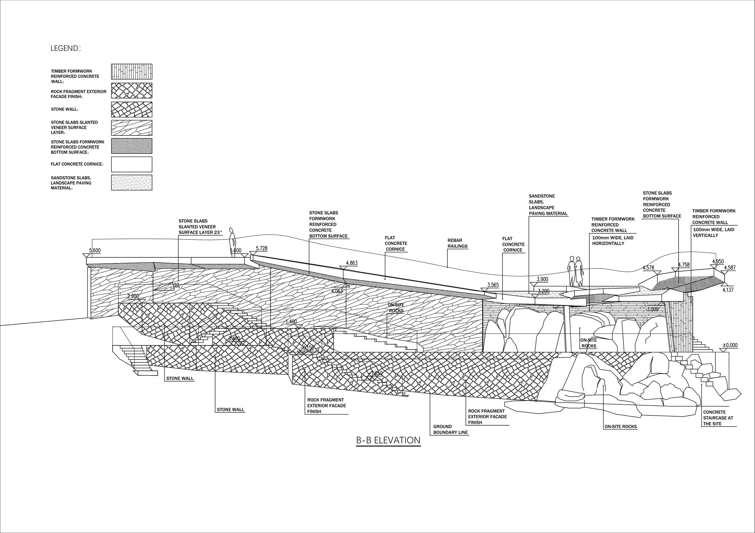 Structurally, the platform presents a deliberate enigma. At the lower level, a single slender concrete column visibly supports the interlocking volumes above, concentrating forces and generating perceptual tension. Technically, this is part of a carefully designed reinforced-concrete frame system: one side rests on a stone-founded wall, while an inclined column hidden within the wall completes the structural balance. The exposed column, left untreated, appears with unmistakable artificial clarity. It acts as a signature of construction itself—once again inscribing a quiet underline beneath nature, and inviting reflection on the relationship between human making and the natural world.