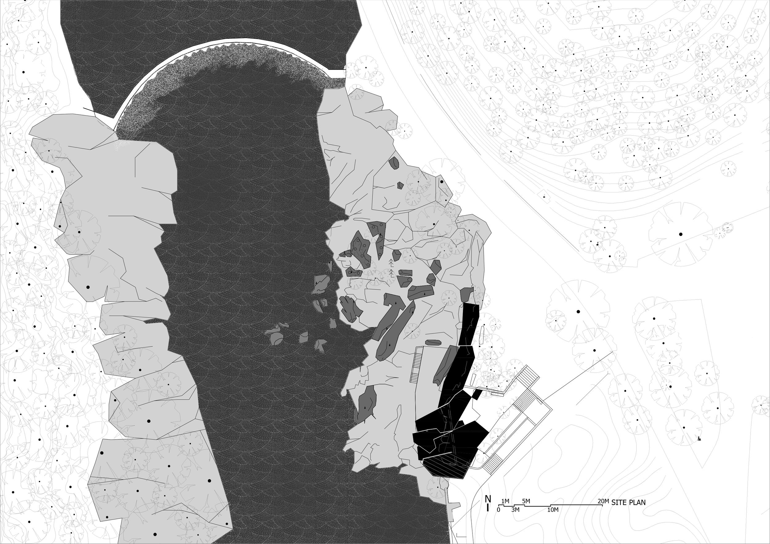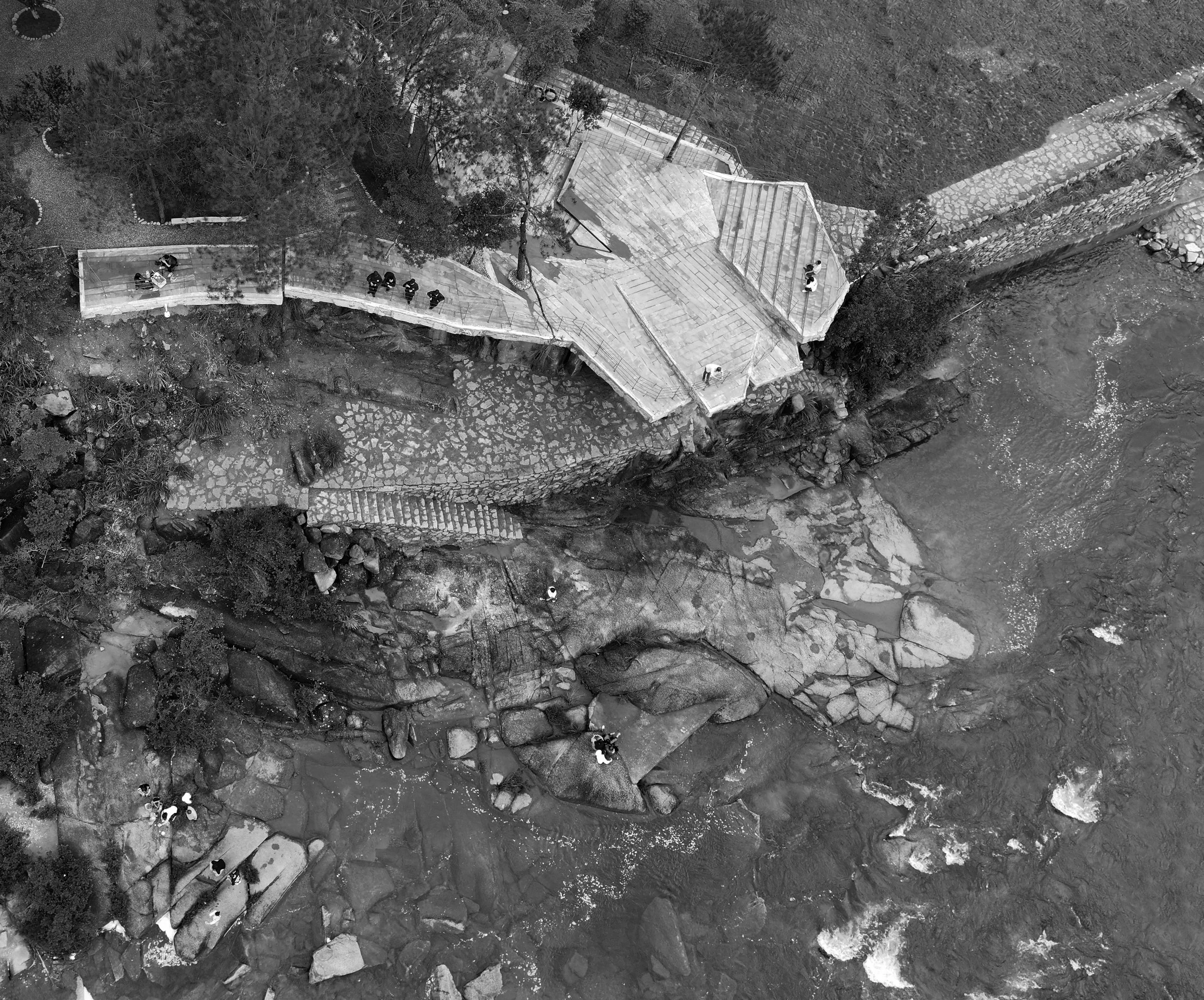The platform occupies the only relatively flat terrace before the waterfall, naturally divided into two levels by native rock. The upper level aligns with the access road and contains sixteen existing trees, all of which were preserved. Concealed behind this grove, the structure projects toward the waterfall from within the rocky terrain. Four interlocking polygonal volumes, each slightly inclined, form a folded geometry reminiscent of riverbed boulders shaped by flowing water. At their intersections, space is left for trees to pass through the architecture, allowing built form and vegetation to coexist.