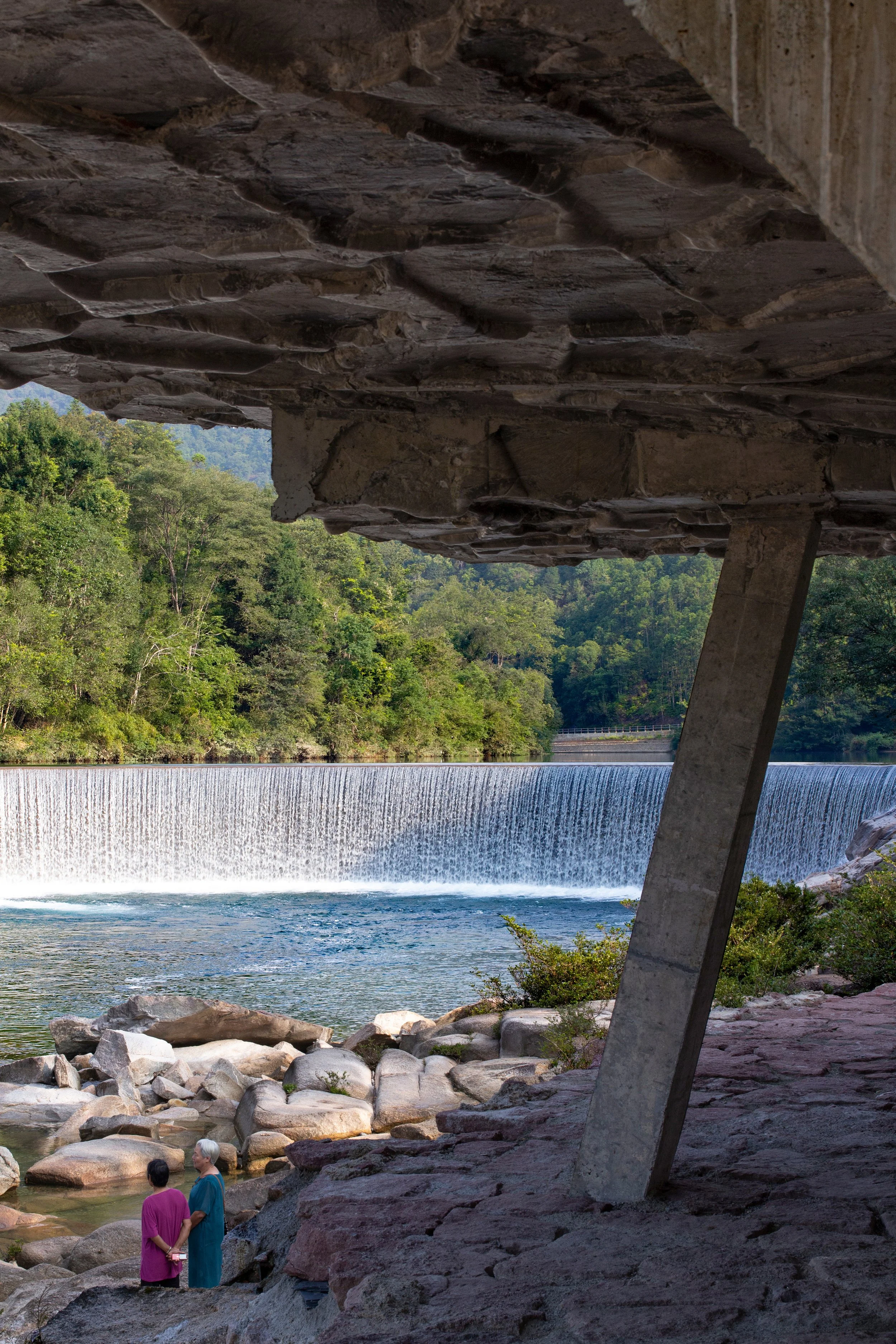 The waterfall originates from an artificial dam built in 1979 for hydrological regulation. Crescent-shaped in plan, it lends Moon Bay its name. Over decades of interaction between human intervention and natural processes, the dam has been fully absorbed into its environment. Upstream, the water settles into a calm surface; downstream, erosion exposes massive river stones. Together, these elements form a place in the phenomenological sense—close to the ground, yet acting as a center that brings sky, mountain, and water into relation.