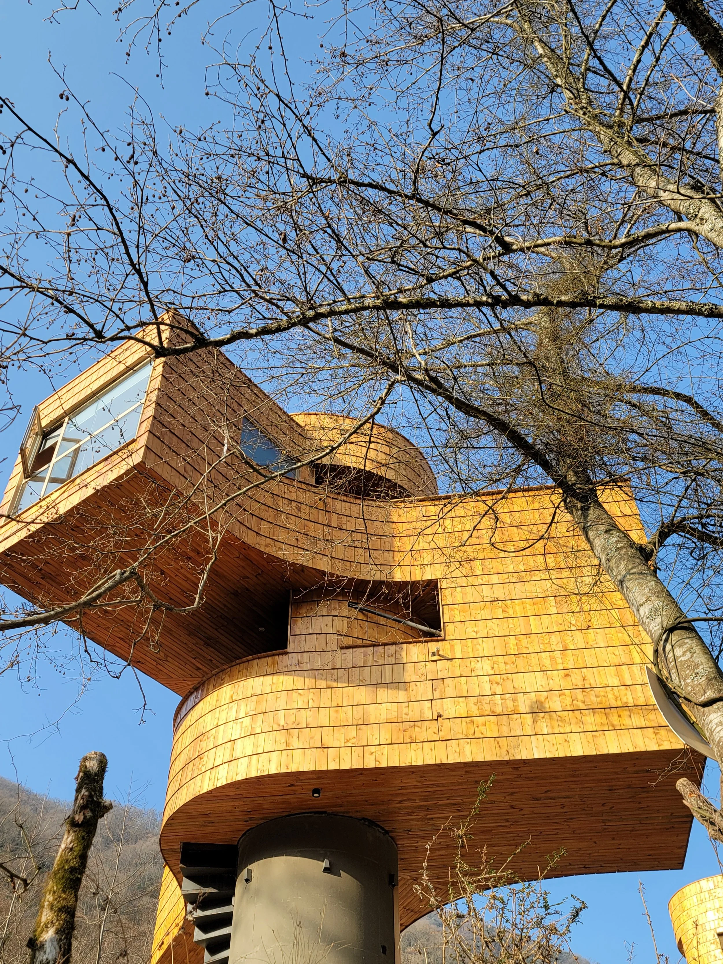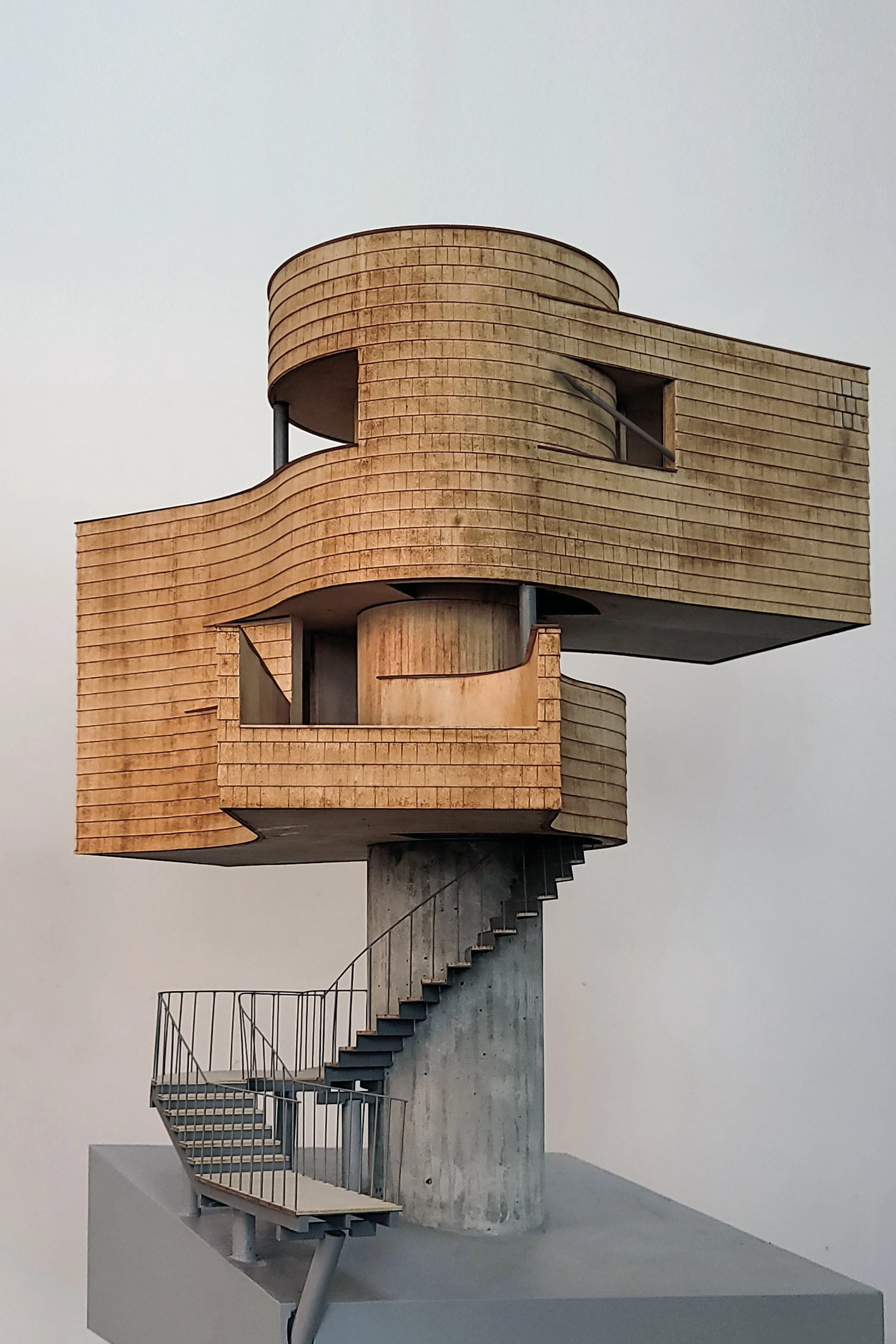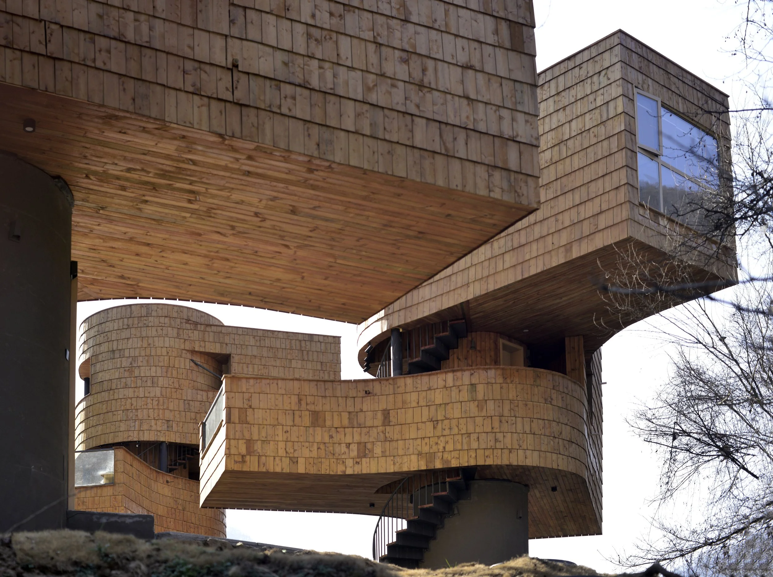 结构上,建筑采用内外双筒体体系。内筒作为主要受力结构,功能空间从筒体向外悬挑,最大悬挑达5.2米。为保持结构平衡,平面采用中心对称的组织方式,使不同标高的空间在整体上保持稳定。结构体系结合混凝土与钢结构:一层内筒采用混凝土以减小结构尺度,上部则转为轻质钢结构体系。悬挑部分通过斜向拉杆形成类似桁架的受力关系,从而减小构件尺寸并降低整体重量。