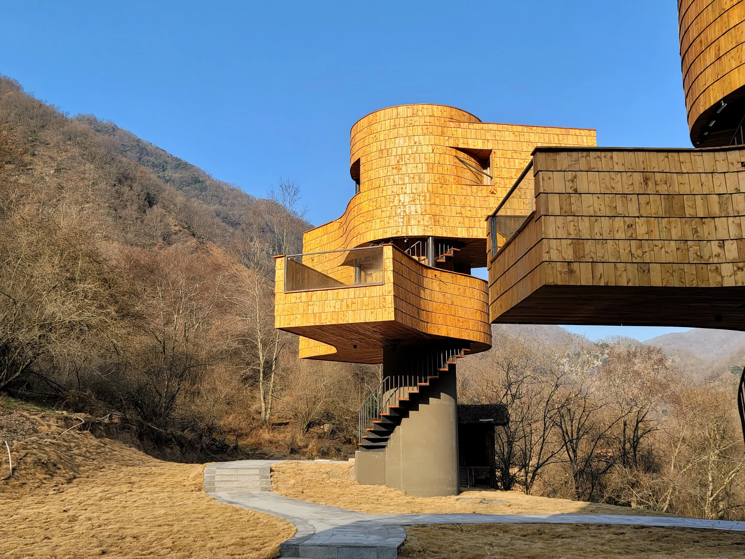 建筑外围护采用轻质构造方式,在钢结构框架内填充木龙骨墙体,外侧覆盖深度炭化木瓦,在满足防水性能的同时,使建筑在森林环境中呈现出克制而内敛的状态。