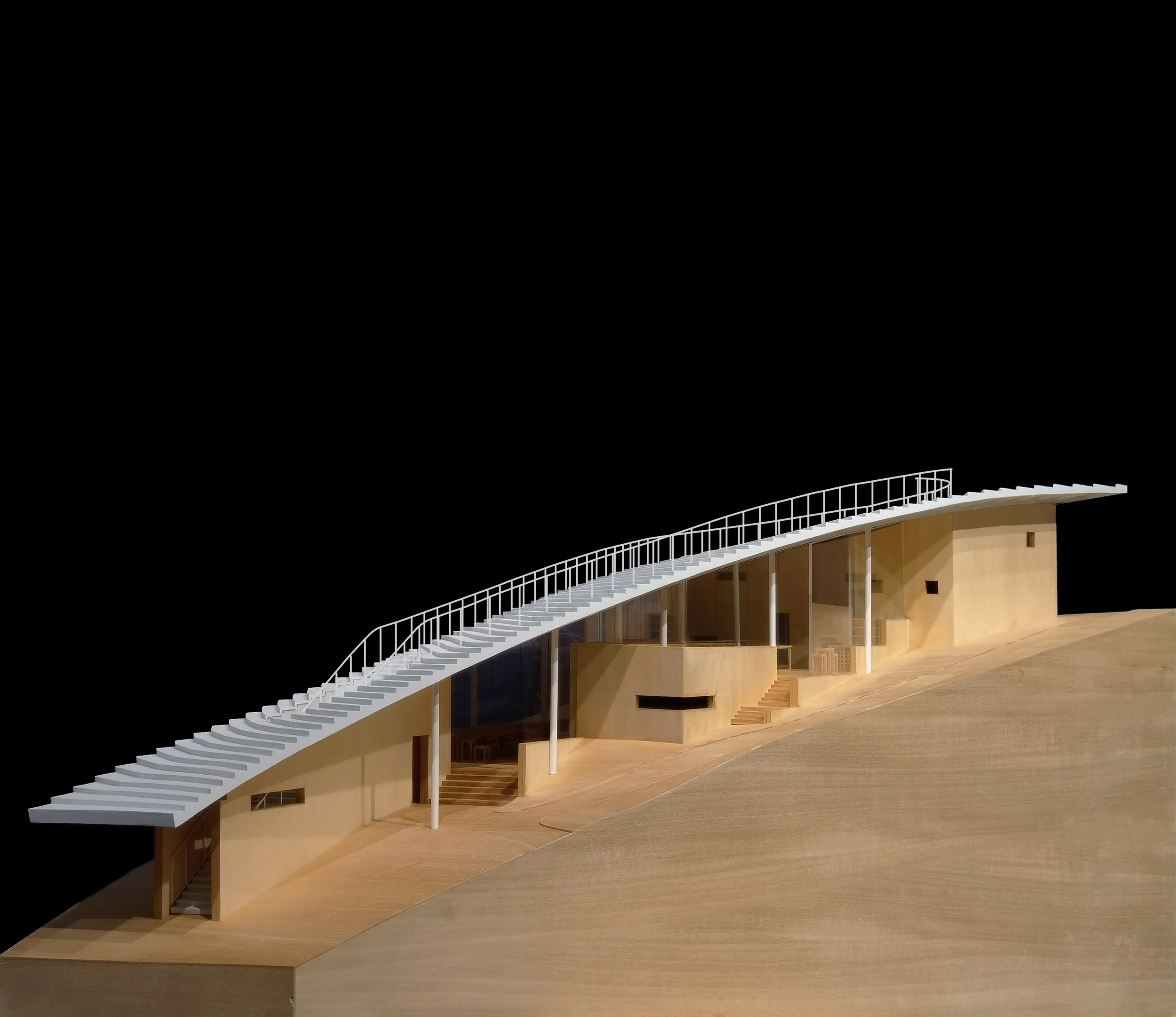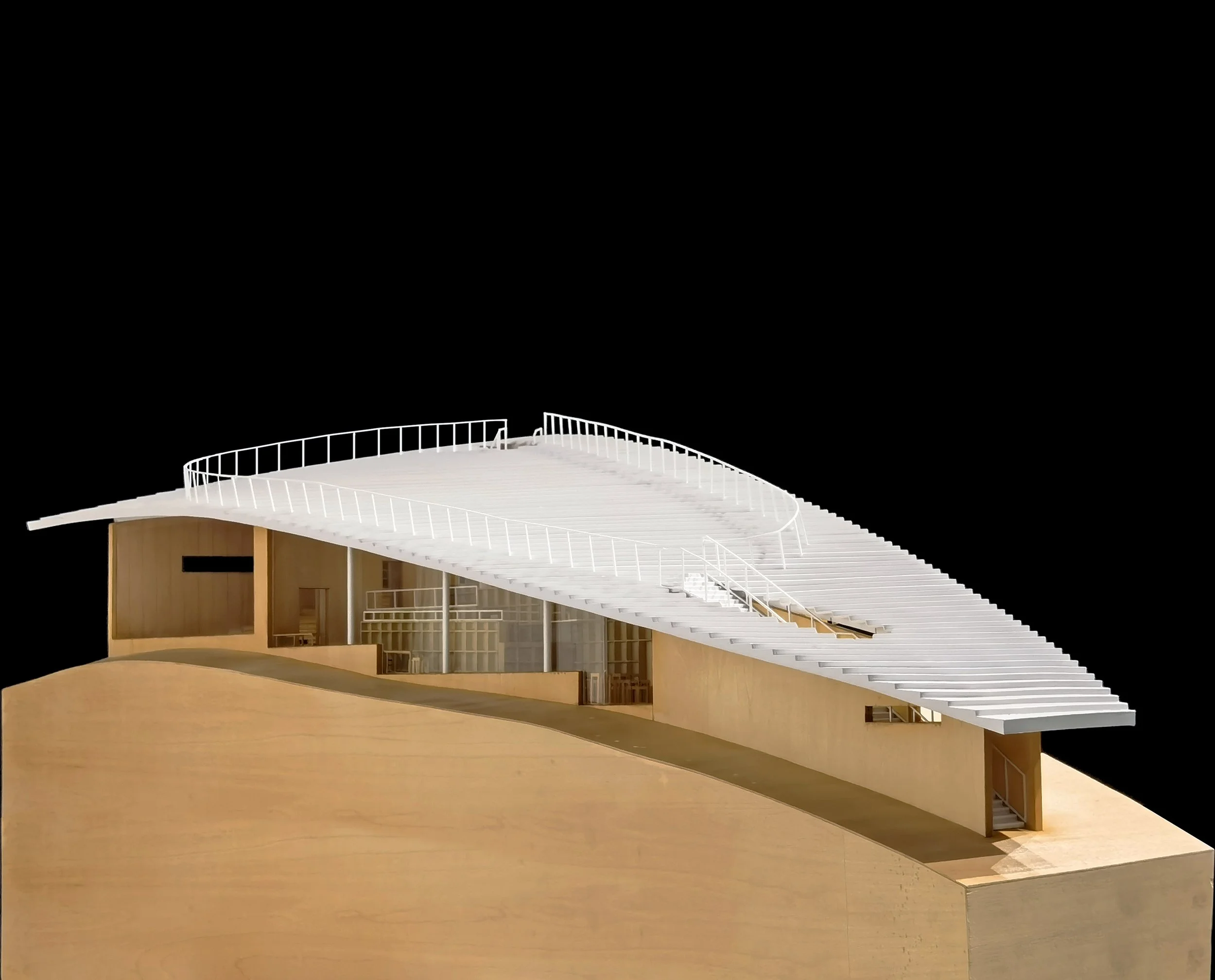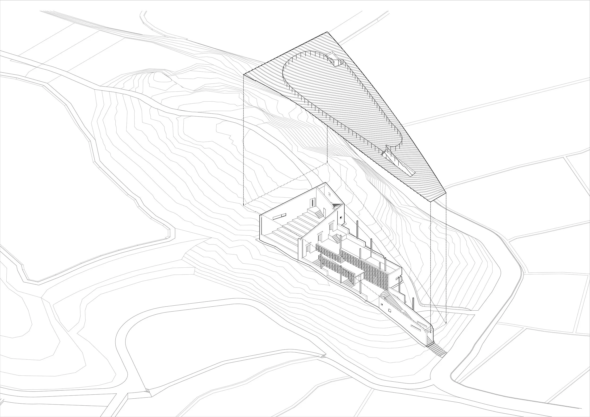 The building occupies part of the hill, while the roof returns this portion to it. This return does not rely on mimicking natural form, but on a more restrained premise: nature itself cannot be directly grasped; what can be grasped are the means by which it is described. In architectural practice, this often takes the form of contour lines—an abstraction that transforms continuous terrain into a measurable sequence.