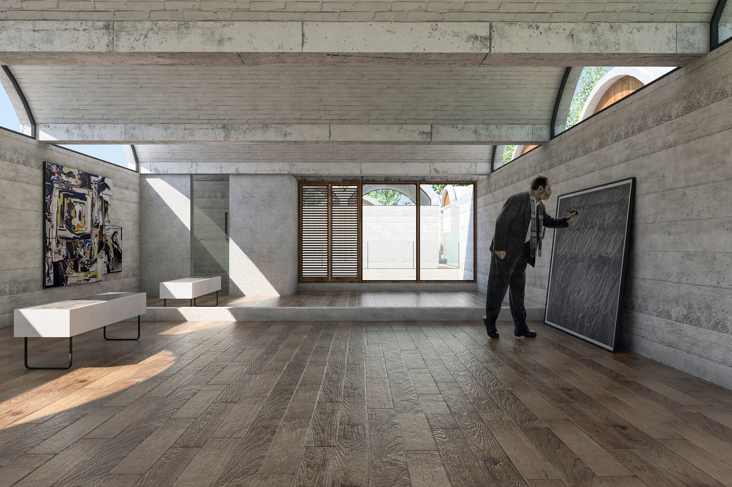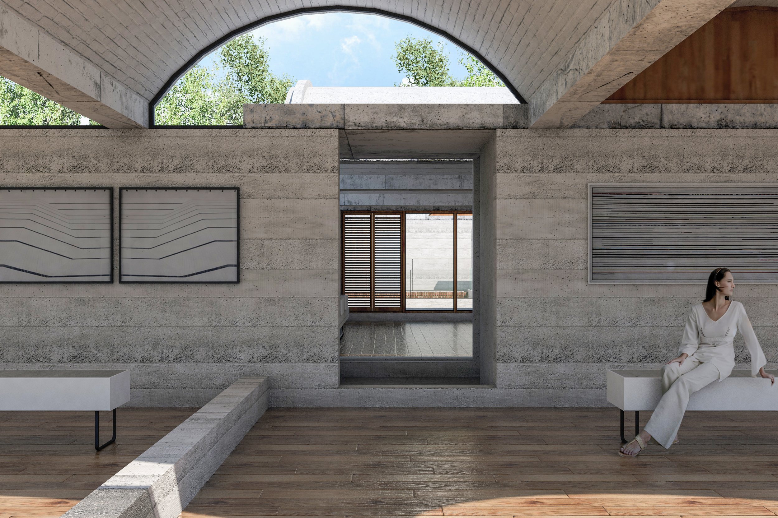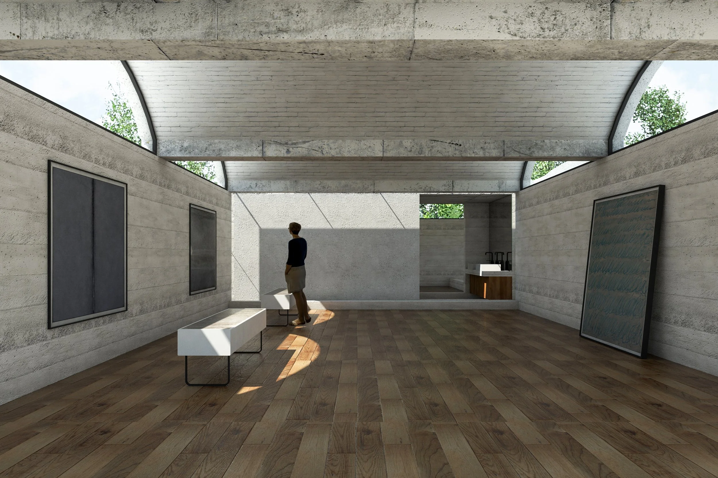 The building integrates multiple functions, including studio spaces, artist and architect residencies, and a semi-public tea room. Private living spaces are contained within the rammed earth volumes, while the interstitial areas form fluid communal spaces. Daily work, living, and public activities overlap, creating a continuous environment of production and exchange.