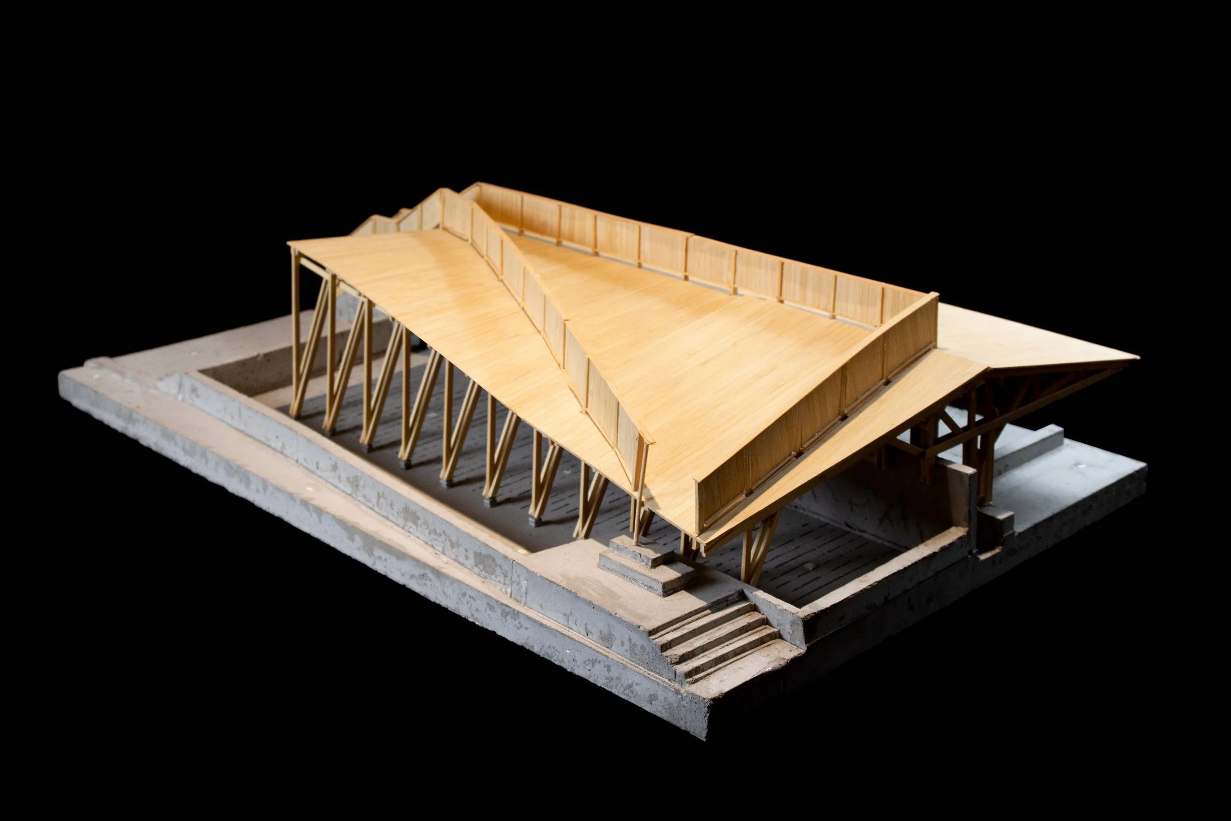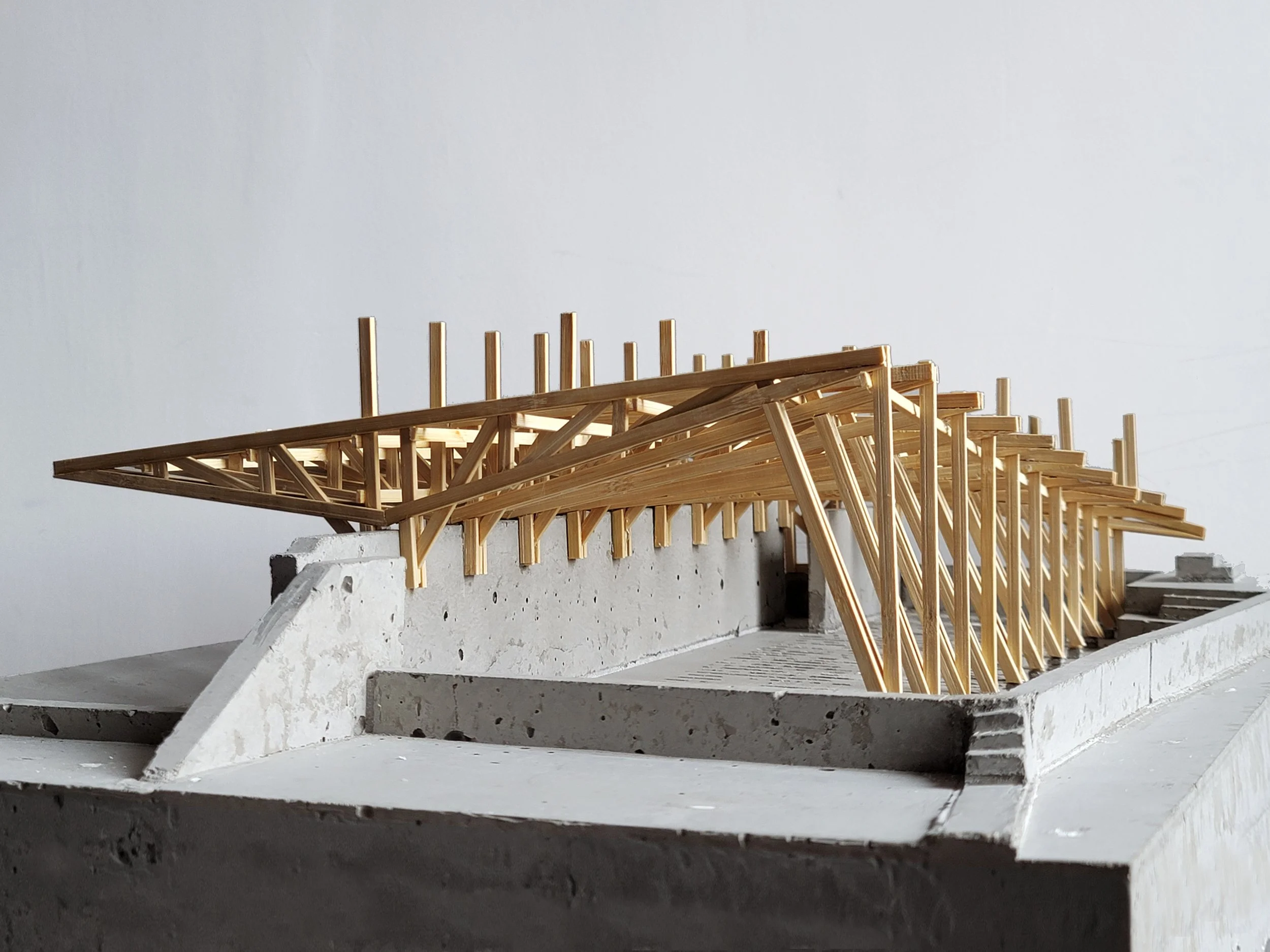 The architecture is composed of a series of lightweight timber frames with relatively small cross-sections. These frames are arranged in a continuous sequence, forming a roofscape that rises and falls across the site. The height of each structural bay varies, generating a dynamic spatial profile.